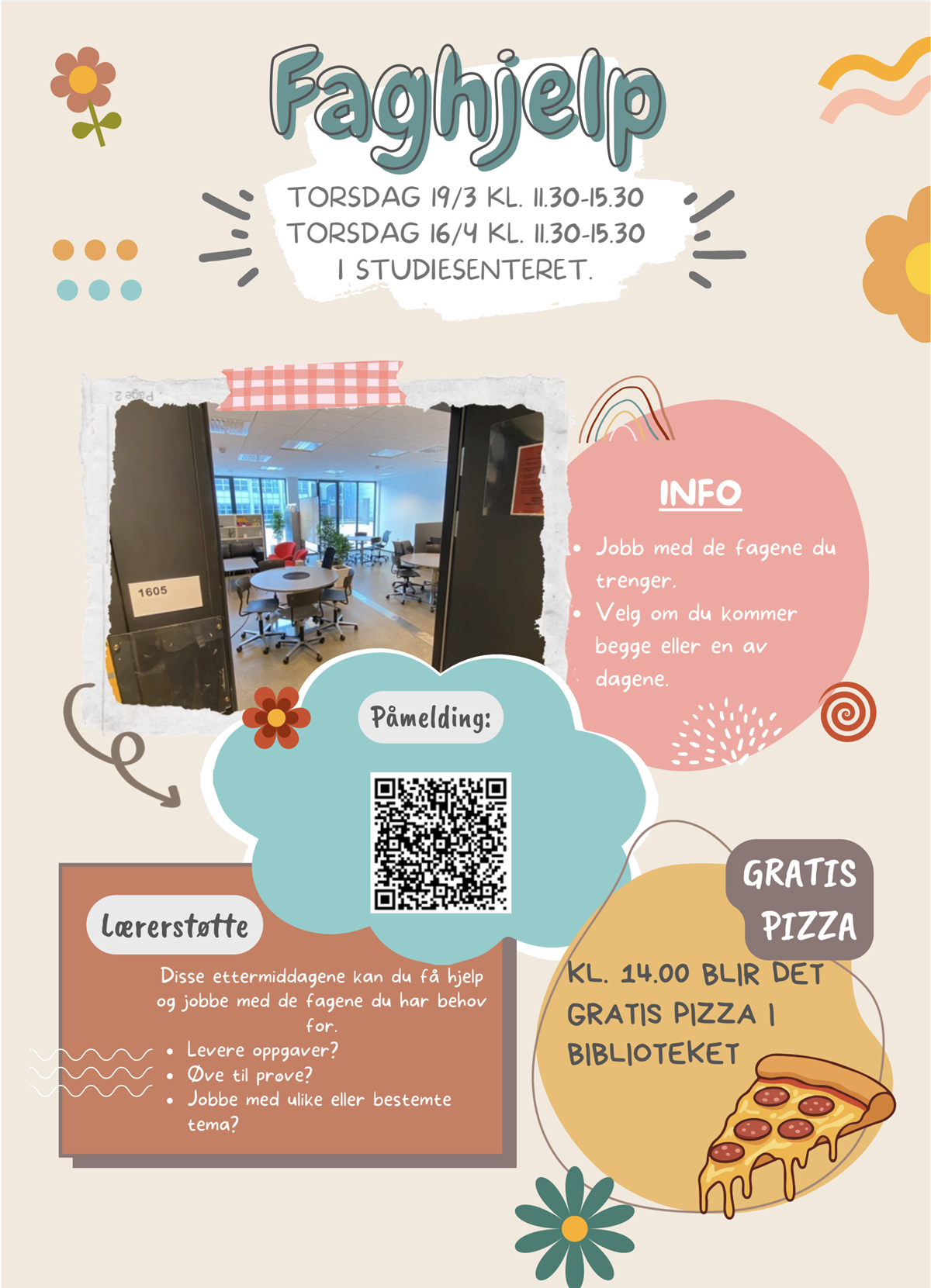 Torsdag 19.03.26 kl.11.30-15.30 og torsdag 16.04.26 kl.11.30-15.30 er det faghjelp på skolen. Det betyr at du kan komme for å jobbe med det faget eller de oppgavene de har behov for, både fellesfag og programfag (ikke verksted). Det vil være lærere tilgjengelig for å støtte de i arbeidet.